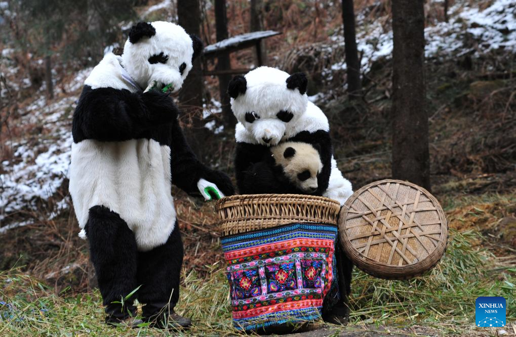 This file photo taken on Nov. 20, 2010 shows staff members dressed up in giant panda costumes holding a giant panda cub into a bamboo basket at the second-phase giant panda wild training fields of Hetaoping panda base in Wolong, southwest China's Sichuan Province. (CCRCGP/Handout via Xinhua)