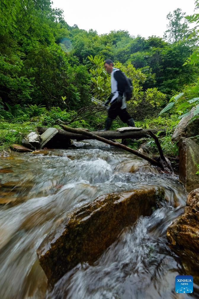 Staff member Mu Shijie prepares to patrol the giant panda wild training fields of Tiantai Mountain in Wolong National Nature Reserve in southwest China's Sichuan Province, June 24, 2024. (Xinhua/Shen Bohan)