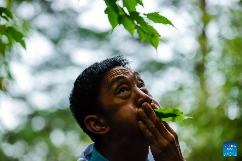 Staff member Mu Shijie uses a DIY bamboo leaf whislte to call giant panda Hui Hui out for foraging at the second-phase giant panda wild training fields of Tiantai Mountain in Wolong National Nature Reserve in southwest China's Sichuan Province, June 24, 2024. (Xinhua/Shen Bohan)