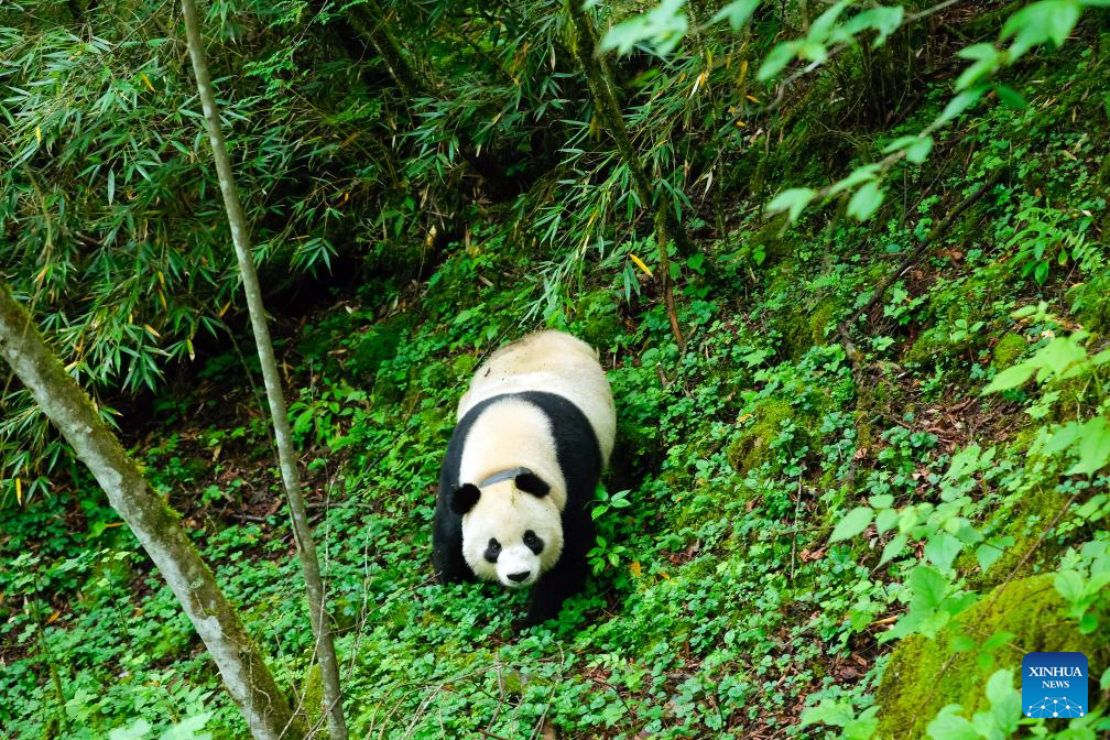 Giant panda Xian Xian is pictured at the second-phase giant panda wild training fields of Tiantai Mountain in Wolong National Nature Reserve in southwest China's Sichuan Province, June 24, 2024. (Xinhua/Shen Bohan)