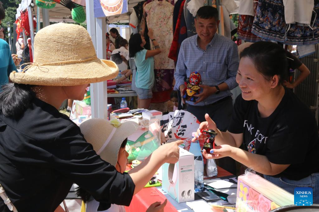 People select Chinese products at the Second Dragon Boat Festival in Sofia, Bulgaria, June 29, 2024. The Second Dragon Boat Festival kicked off at picturesque Pancharevo Lake on Saturday, featuring a dragon boat racing and two days of diverse cultural showcases. (Xinhua/Lin Hao)