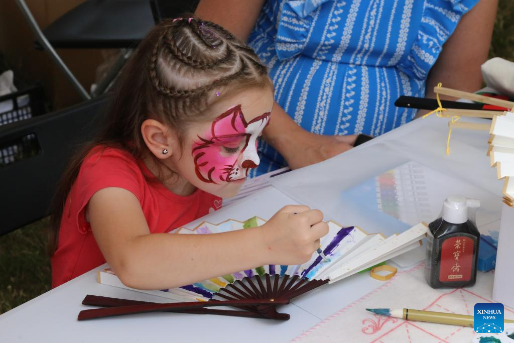 A child paints on a traditional Chinese fan at the Second Dragon Boat Festival in Sofia, Bulgaria, June 29, 2024. The Second Dragon Boat Festival kicked off at picturesque Pancharevo Lake on Saturday, featuring a dragon boat racing and two days of diverse cultural showcases. (Xinhua/Lin Hao)