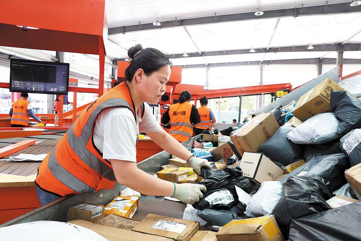Staff members at the joint distribution center in Yucheng handle parcels with the help of a sorting machine. ZHANG YU/CHINA NEWS SERVICE