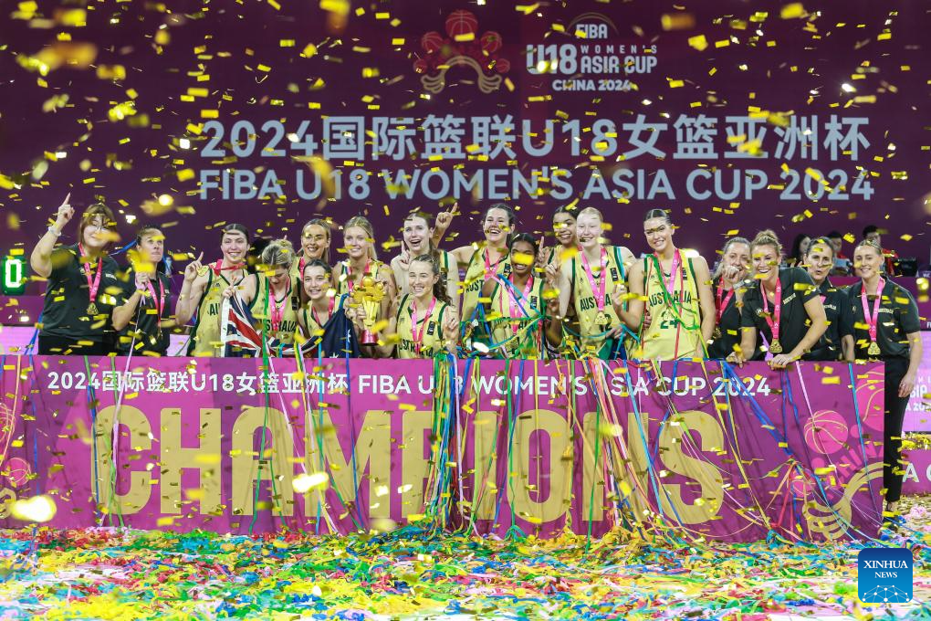 Members of team Australia celebrate during the awarding ceremony for the final match between China and Australia at the FIBA U18 Women's Asian Cup 2024 in Shenzhen, south China's Guangdong Province, June 30, 2024. (Photo by Peng Zhigang/Xinhua)