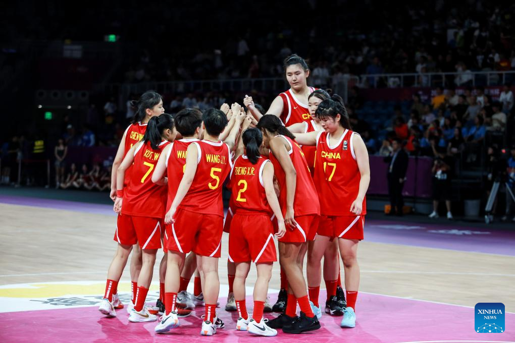 Players of team China cheer up before the final match between China and Australia at the FIBA U18 Women's Asian Cup 2024 in Shenzhen, south China's Guangdong Province, June 30, 2024. (Photo by Peng Zhigang/Xinhua)