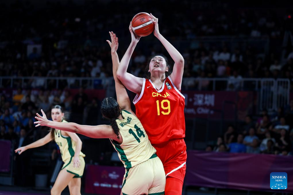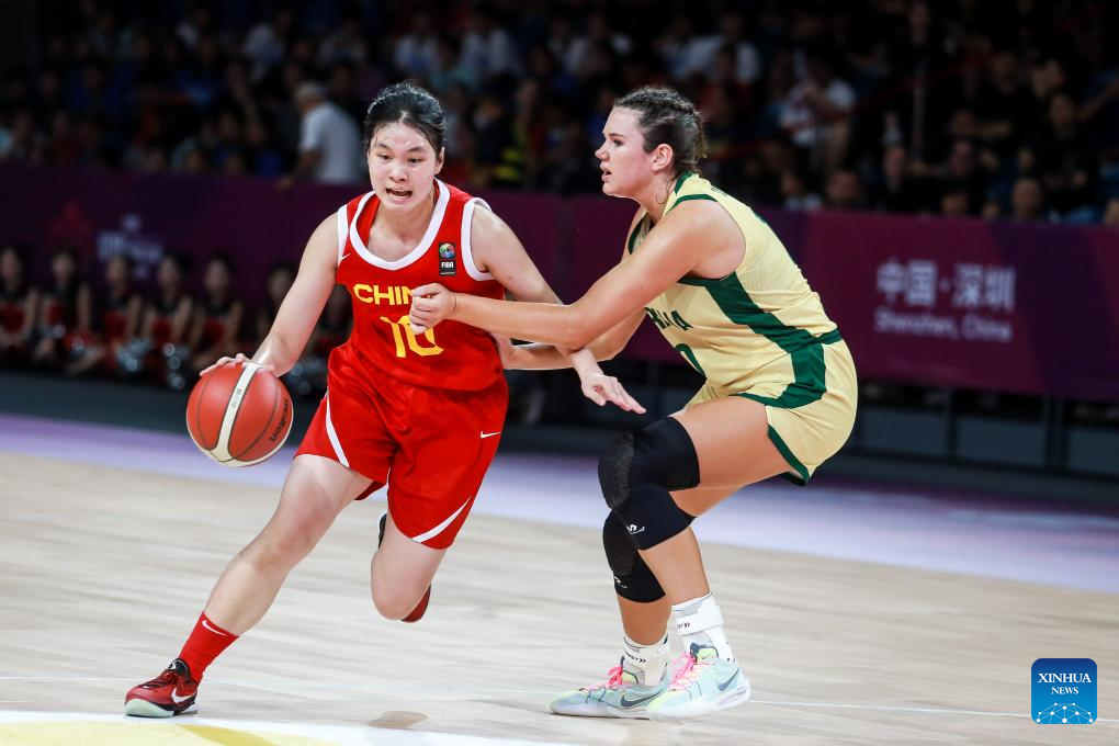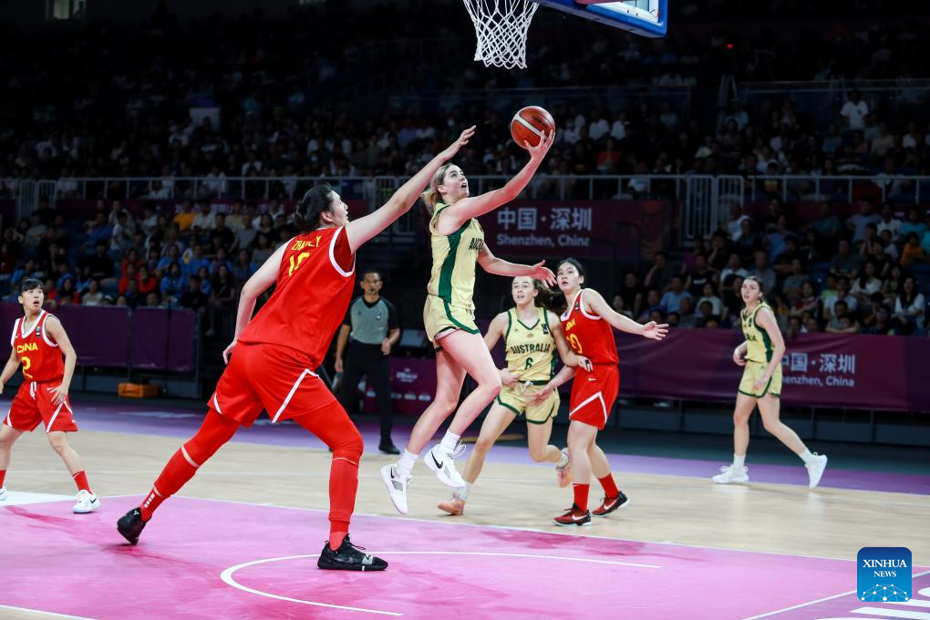 Saffron Shiels (R) of Australia competes during the final match between China and Australia at the FIBA U18 Women's Asian Cup 2024 in Shenzhen, south China's Guangdong Province, June 30, 2024. (Photo by Peng Zhigang/Xinhua)