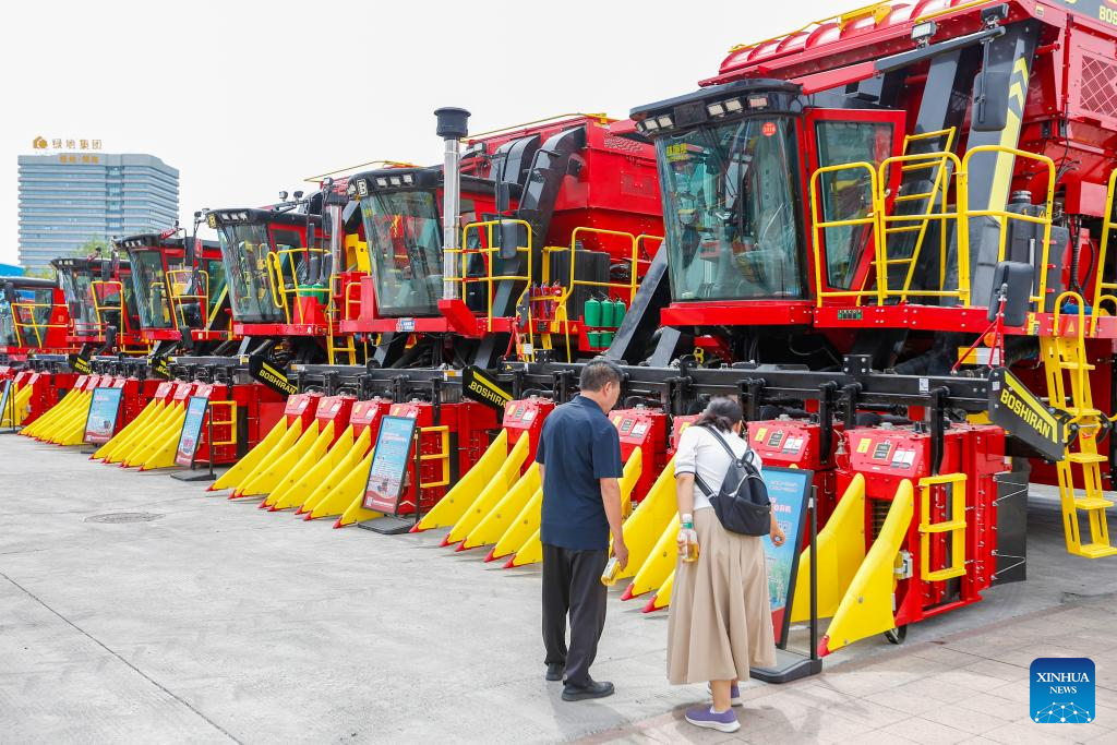 Visitors view cotton pickers displayed at the 8th China-Eurasia Expo in Urumqi, northwest China's Xinjiang Uygur Autonomous Region, June 30, 2024. Themed "New Opportunities of Silk Road, New Vitality for Eurasian Cooperation," the five-day expo that opened on June 26 has drawn over 1,900 participants from 50 countries, regions and international organizations, showcasing over 6,000 varieties of products. (Xinhua/Chen Shuo)