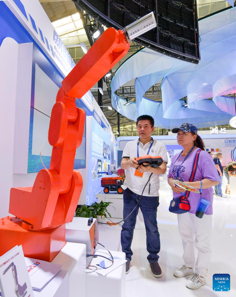 A staff member operates an industrial robot at the 8th China-Eurasia Expo in Urumqi, northwest China's Xinjiang Uygur Autonomous Region, June 26, 2024. Themed "New Opportunities of Silk Road, New Vitality for Eurasian Cooperation," the five-day expo that opened on June 26 has drawn over 1,900 participants from 50 countries, regions and international organizations, showcasing over 6,000 varieties of products. (Xinhua/Wang Fei)