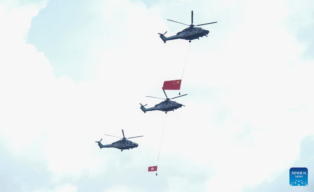 Helicopters carrying China's national flag and the flag of the Hong Kong Special Administrative Region (HKSAR) are seen during a flag-raising ceremony held by the HKSAR government to celebrate the 27th anniversary of Hong Kong's return to the motherland in Hong Kong, south China, July 1, 2024. (Xinhua/Lui Siu Wai)