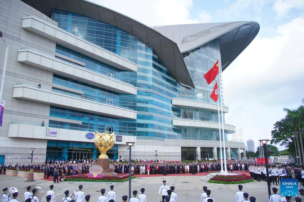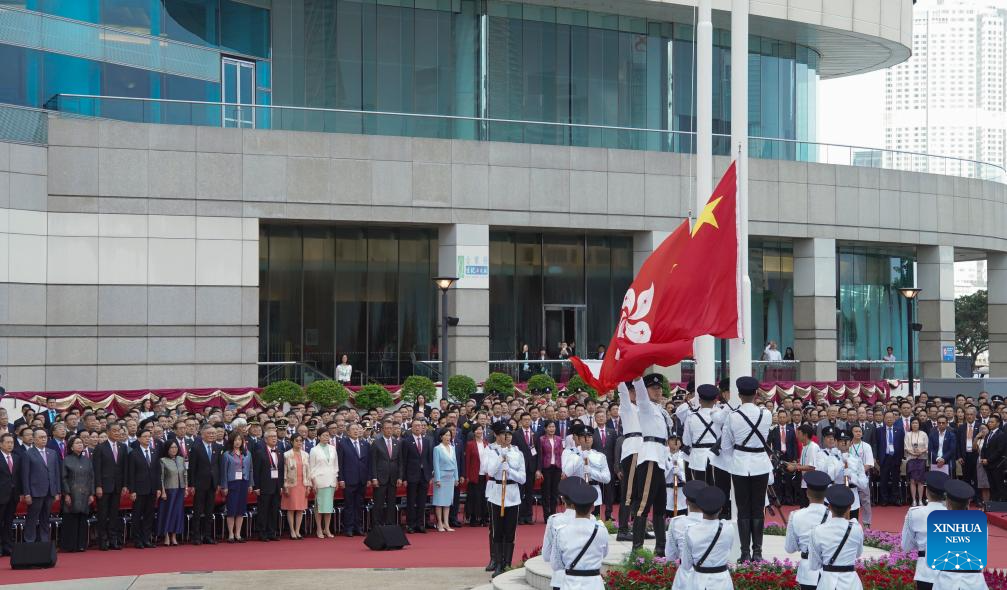 A flag-raising ceremony is held by the government of the Hong Kong Special Administrative Region (HKSAR) to celebrate the 27th anniversary of Hong Kong's return to the motherland, at the Golden Bauhinia Square in Hong Kong, south China, July 1, 2024. (Xinhua/Lui Siu Wai)