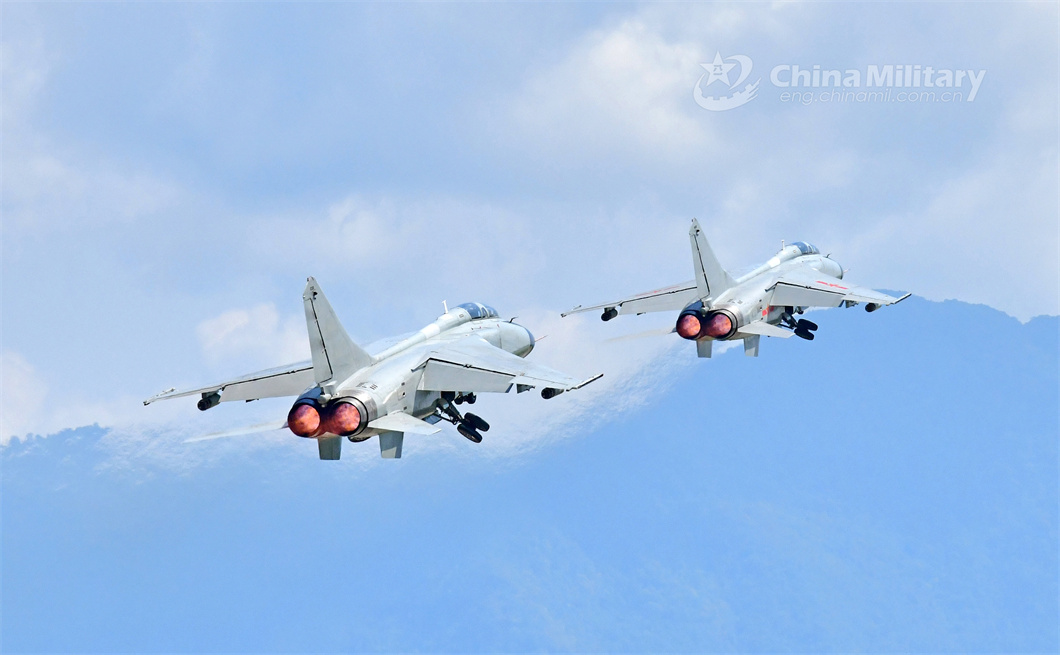 Fighter jets attached to an aviation brigade under the PLA Air Force take off in formation during a flight training exercise on June 14, 2024. (eng.chinamil.com.cn/Photo by Zhuo Lingpeng)