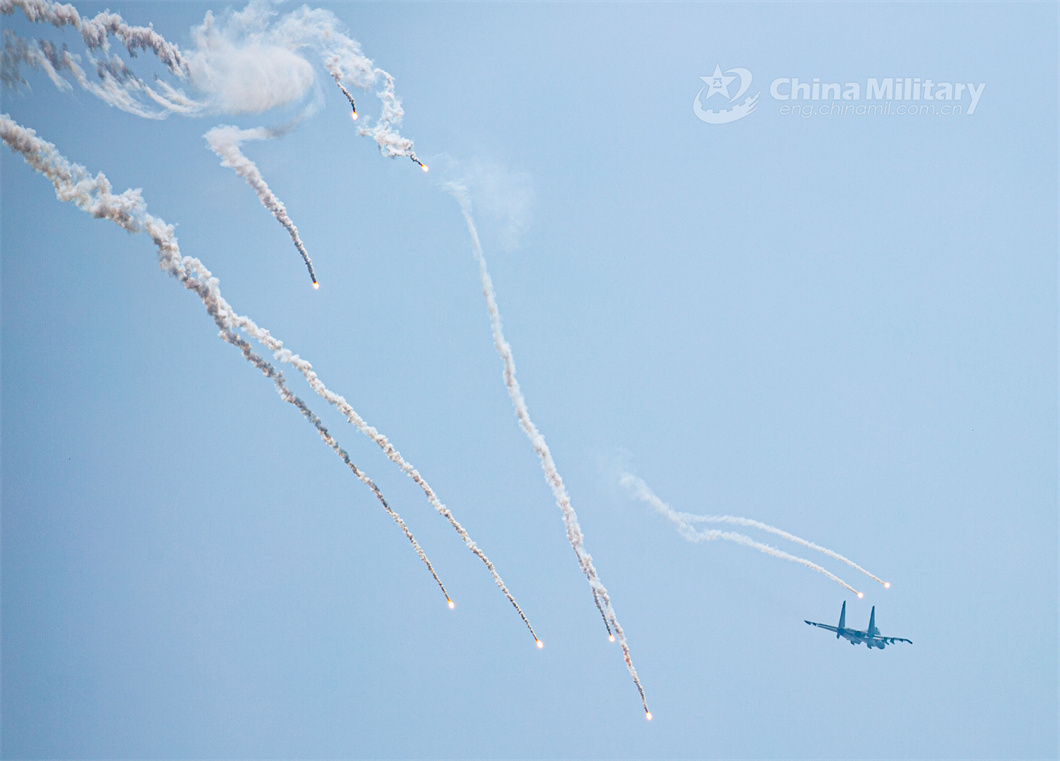 A fighter jet attached to an aviation brigade with the air force under the PLA Northern Theater Command fires off flares during a flight training exercise on June 15, 2024. (eng.chinamil.com.cn/Photo by Wang Hao)