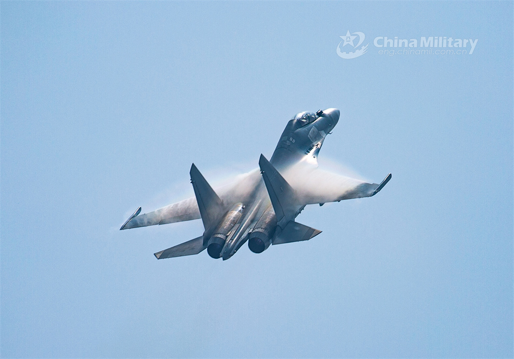 A fighter jet attached to an aviation brigade with the air force under the PLA Northern Theater Command soars into the sky during a flight training exercise on June 15, 2024. (eng.chinamil.com.cn/Photo by Wang Hao)