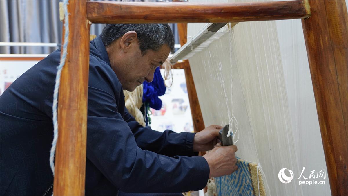 Yang Yongliang weaves the Jiaya Tibetan carpet in an intangible cultural heritage exhibition hall in Huangzhong district of Xining, the capital city of northwest China's Qinghai Province. (People's Daily Online/Yang Qihong)