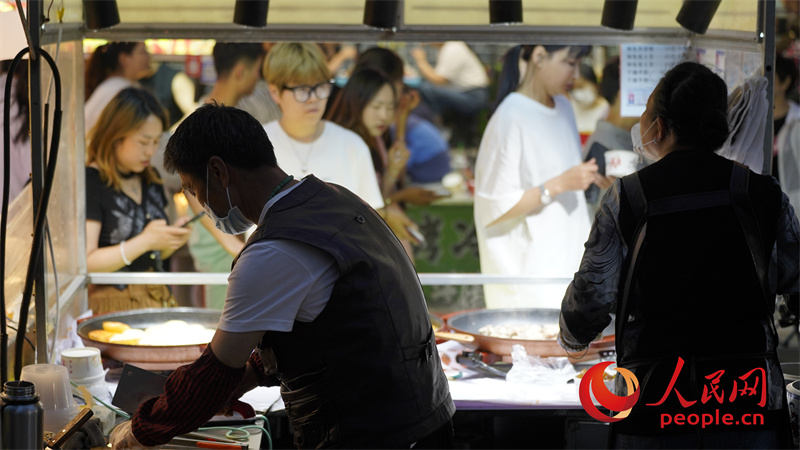 Employees make local specialty food at the Daxinjie night market in Xining, capital city of northwest China's Qinghai Province. (People's Daily Online/Gan Haiqiong)
