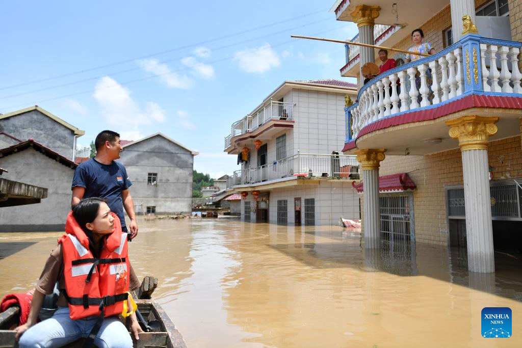 Rescuers transfer stranded residents in Pingjiang county, central China's Hunan Province, July 2, 2024. The flooding water in Pingjiang county is gradually declining. As of 6 p.m. on July 2, the water level of Pingjiang watch station of the Miluo River was 76.18 meters, still 5.68 meters above the warning mark, but 1.49 meters lower than the peak level. (Xinhua/Chen Sihan)