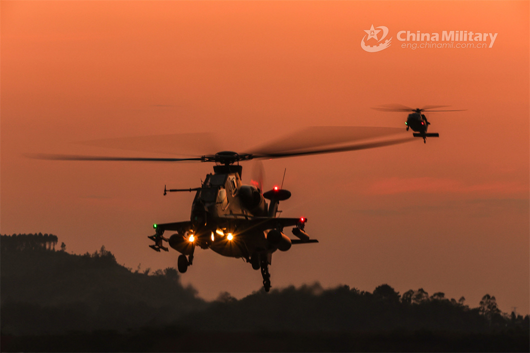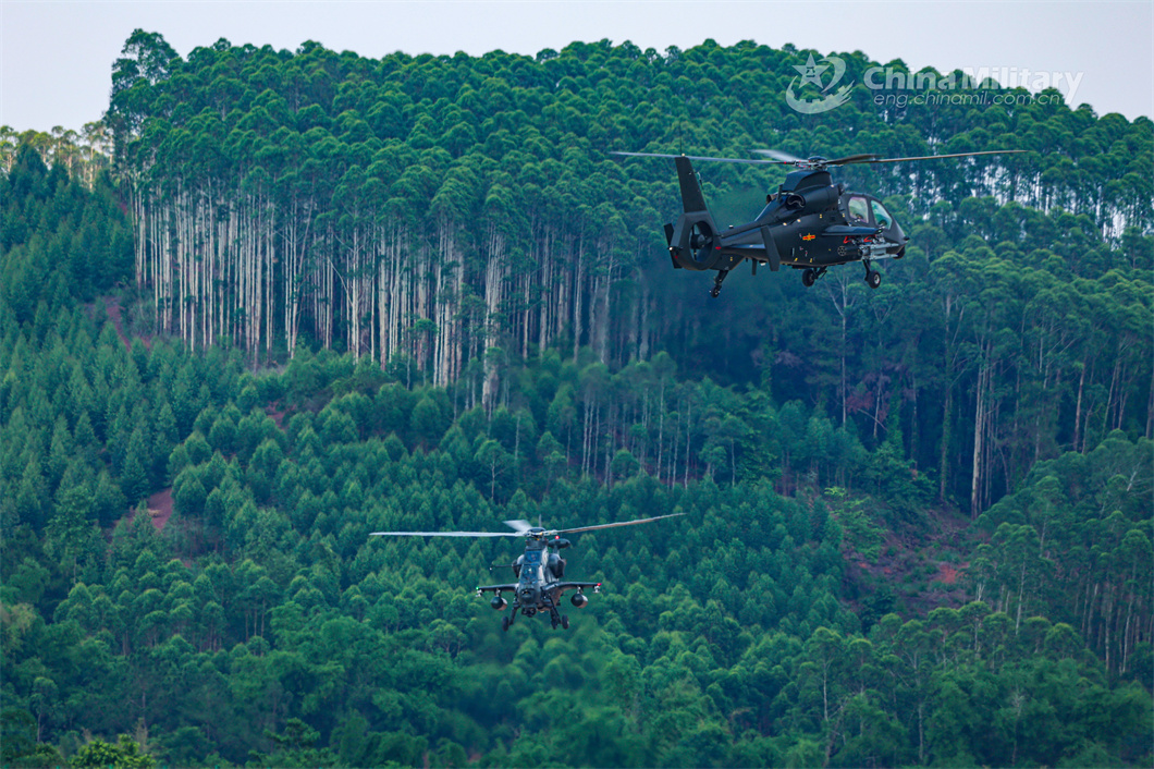 Two helicopters attached to a brigade of the PLA Army fly over the wooded and hilly lands at a designated altitude during a flight training exercise on June 13, 2024. (eng.chinamil.com.cn/Photo by Sun Changyi)