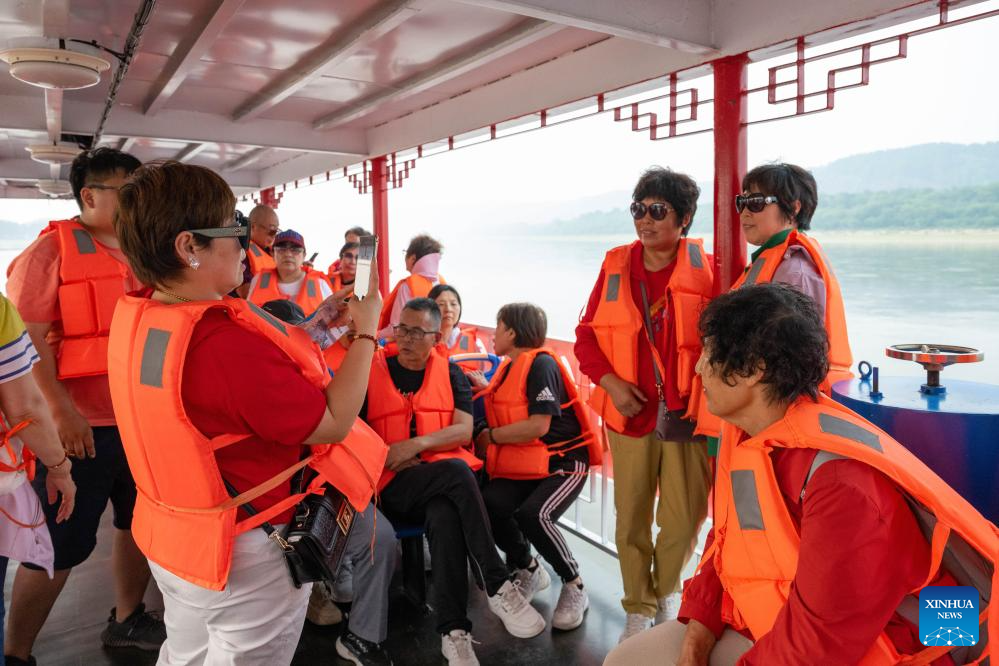 Tourists pose for a photo on a sightseeing boat on the Heilongjiang River in Mohe, northeast China's Heilongjiang Province, July 2, 2024. Lots of visitors travel to Mohe, China's northernmost city, in summer to enjoy some leisure time. In recent years, Mohe, focusing on its unique location, continues to improve its infrastructure and develop tourism products to attract more tourists in all seasons. (Xinhua/Xie Jianfei)