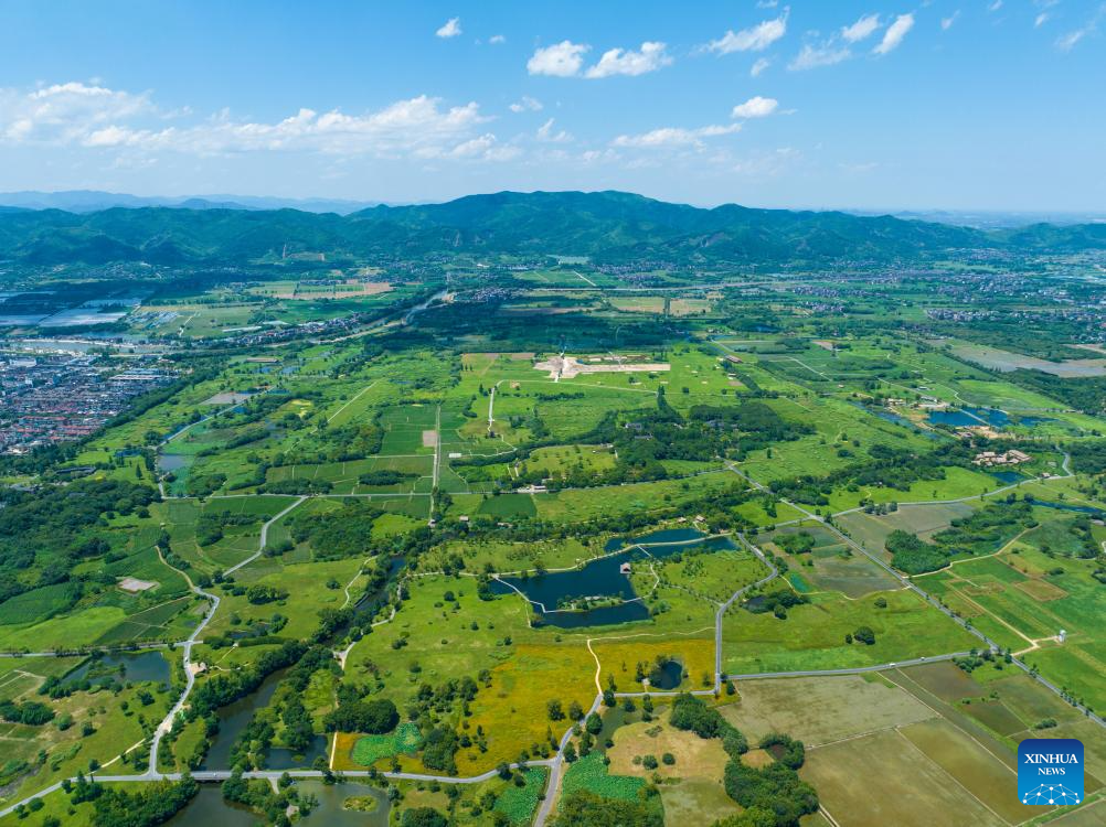 An aerial drone photo taken on July 4, 2024 shows the Archaeological Ruins of Liangzhu City park in Hangzhou, capital city of east China's Zhejiang Province. The Archaeological Ruins of Liangzhu City, located in east China's Zhejiang Province, have gained worldwide recognition as bearing testimony to the existence of at least 5,000 years of Chinese civilization. This year marks the 5th anniversary of its inscription on the World Heritage List as a cultural site. (Xinhua/Jiang Han)