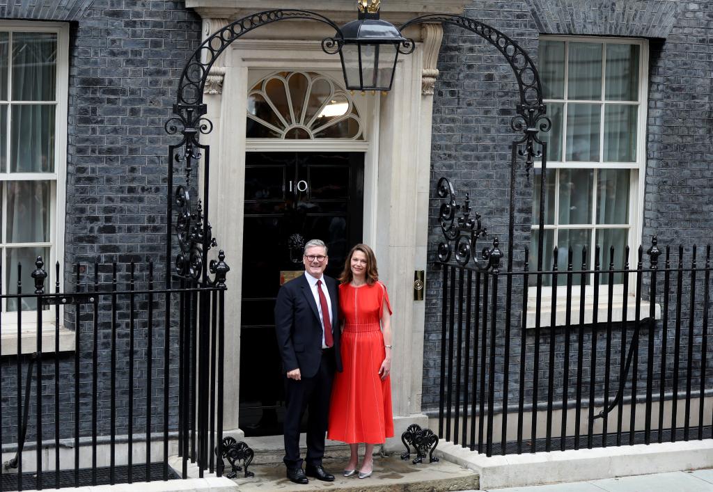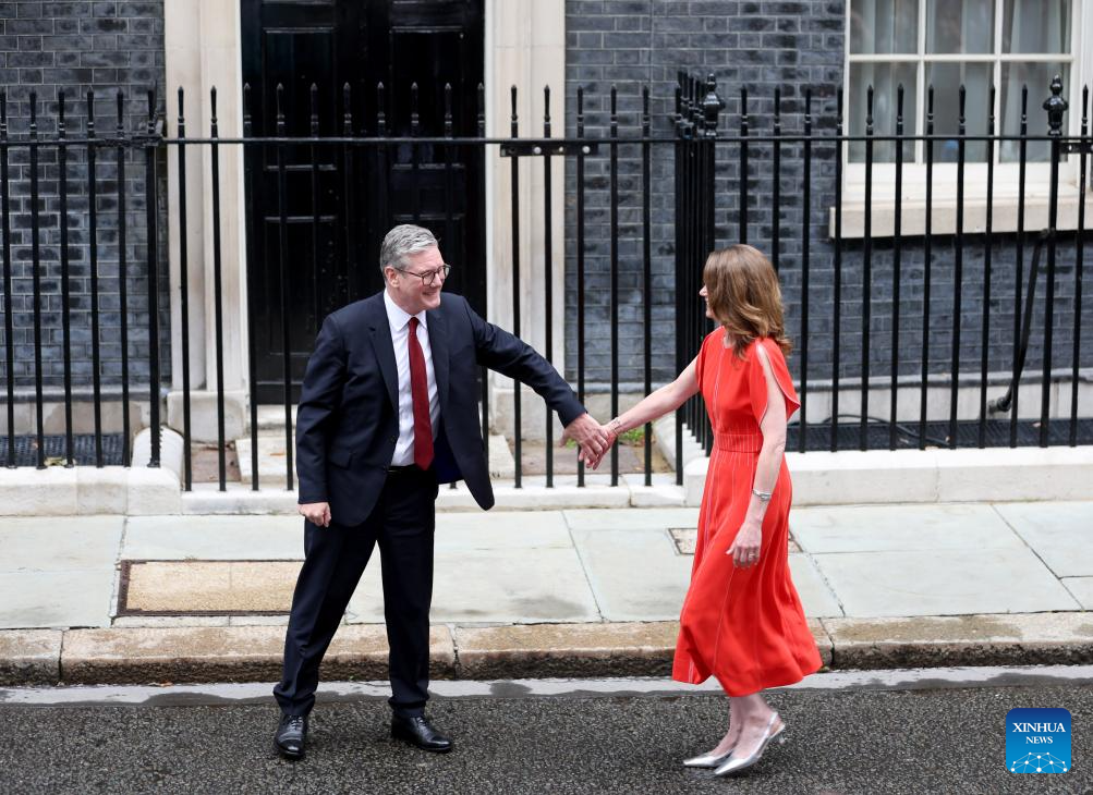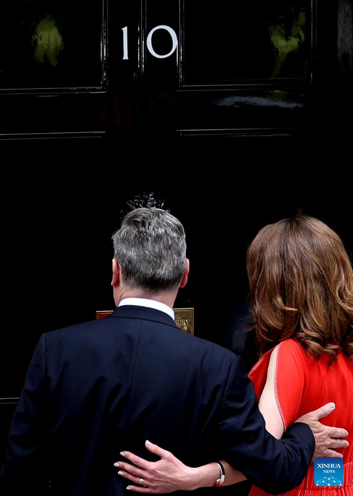Keir Starmer and his wife are pictured after he delivered his first speech as British prime minister in front of 10 Downing Street in London, Britain, July 5, 2024. Keir Starmer, who led the Labour Party to achieve a landslide victory in Britain's general election, officially became the new prime minister after meeting with King Charles III at Buckingham Palace in London on Friday. (Xinhua/Li Ying)