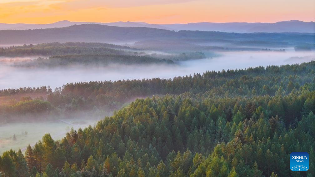 An aerial drone photo taken on early July 5, 2024 shows a view of the Saihanba National Forest Park in Chengde City, north China's Hebei Province. (Photo by Liu Mancang/Xinhua)
