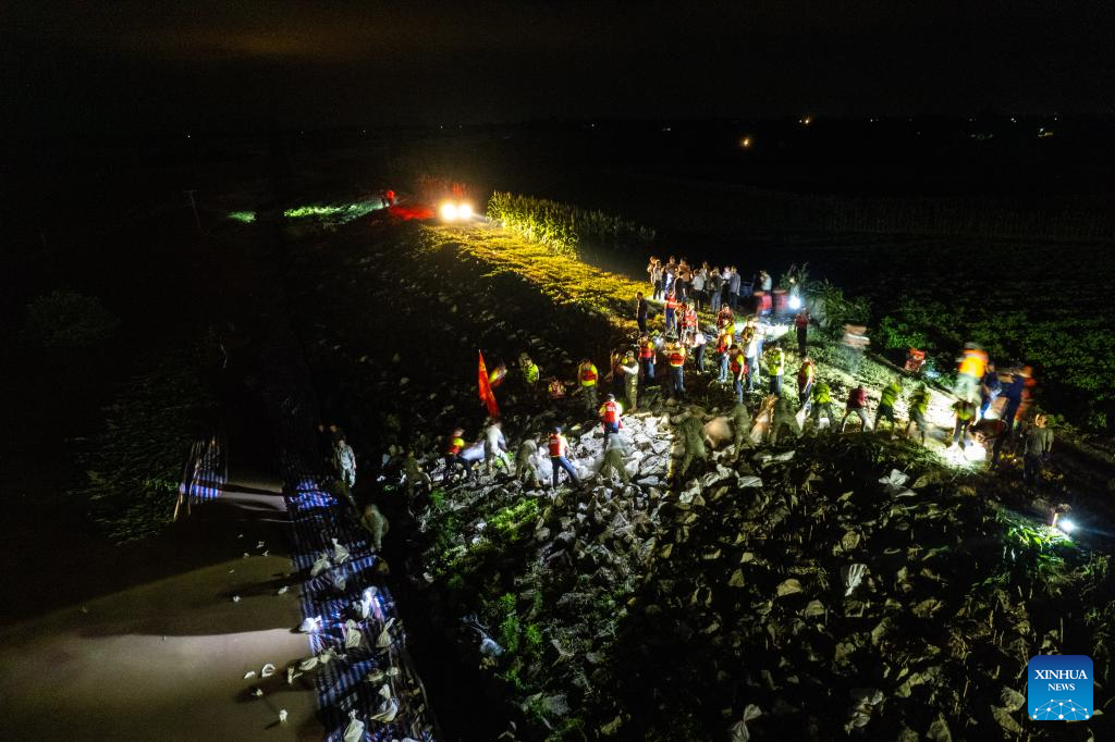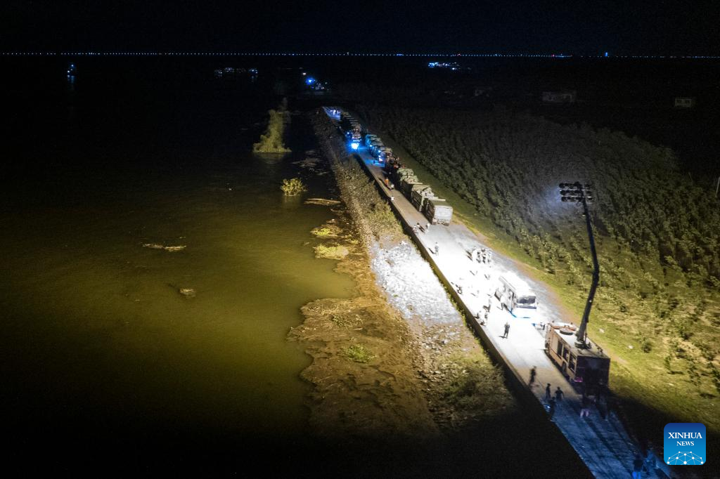 An aerial drone photo taken on July 5, 2024 shows rescuers working on a dike of Dongting Lake in Tuanzhou Township, Huarong County under Yueyang City, central China's Hunan Province. (Xinhua/Chen Sihan)