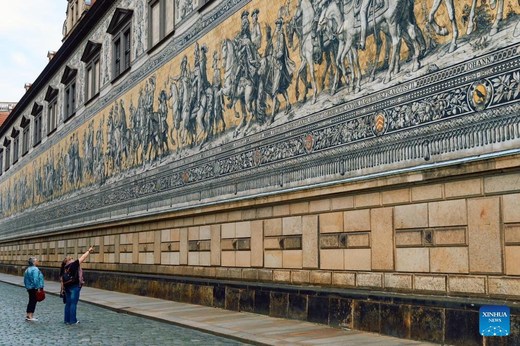 People enjoy a wall painting in Dresden, Germany, July 5, 2024. Dresden, located in the eastern part of Germany, is the capital of German state Saxony. (Xinhua/Meng Dingbo)