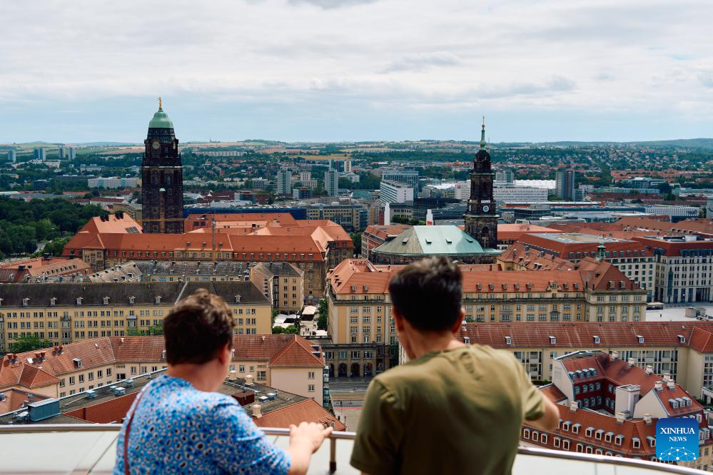 People enjoy the city view on the top of the Frauenkirche in Dresden, Germany, July 5, 2024. Dresden, located in the eastern part of Germany, is the capital of German state Saxony. (Xinhua/Meng Dingbo)
