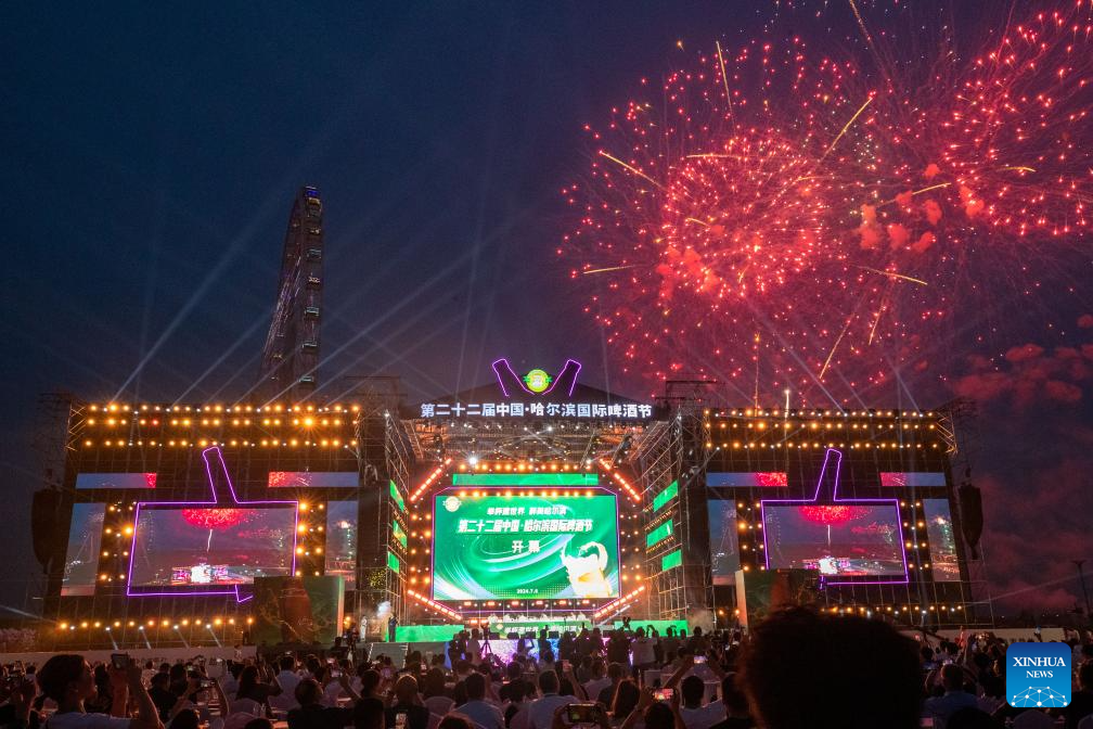 People watch a firework show at the 22nd China Harbin International Beer Festival in Harbin, northeast China's Heilongjiang Province, July 6, 2024. The 22nd China Harbin International Beer Festival opened here on Saturday. (Xinhua/Zhang Tao)