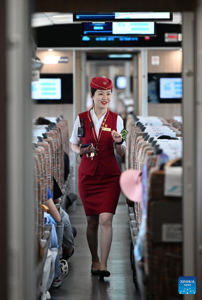 A train attendant works on the G8844 bullet train of a railway connecting north China's Tianjin Municipality with the Beijing Daxing International Airport on July 6, 2024. (Xinhua/Li Ran)