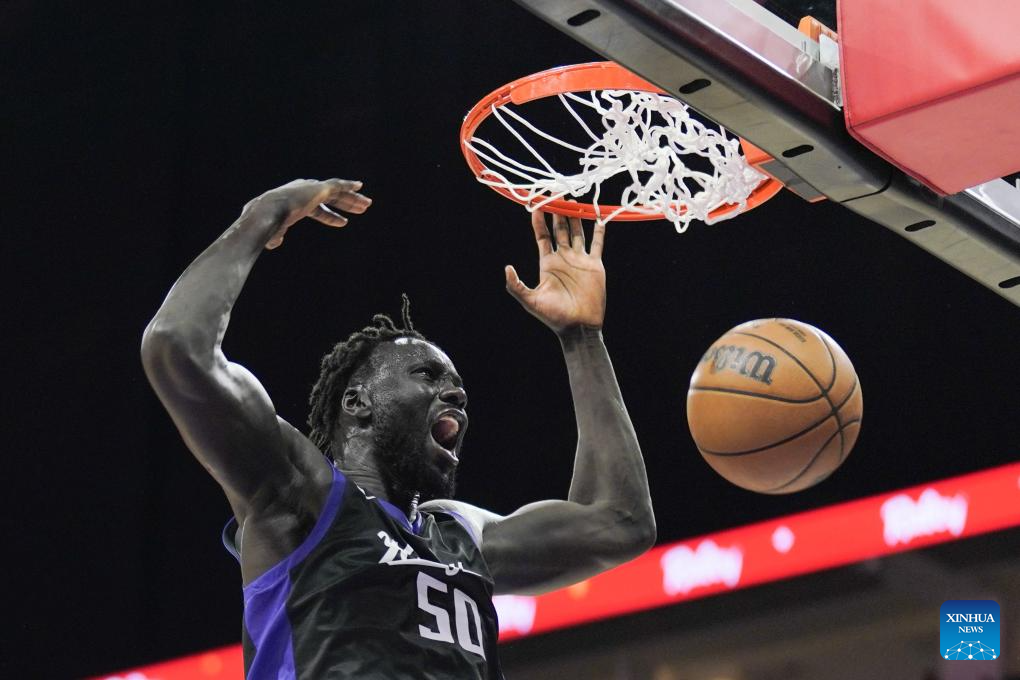 Jo Lual-Acuil Jr. of Sacramento Kings 1 dunks during the match between China and Sacramento Kings 1 at the 2024 California Classic NBA Summer League at the Golden 1 center in Sacramento, the United States, July 6, 2024. (Xinhua/Wu Xiaoling)