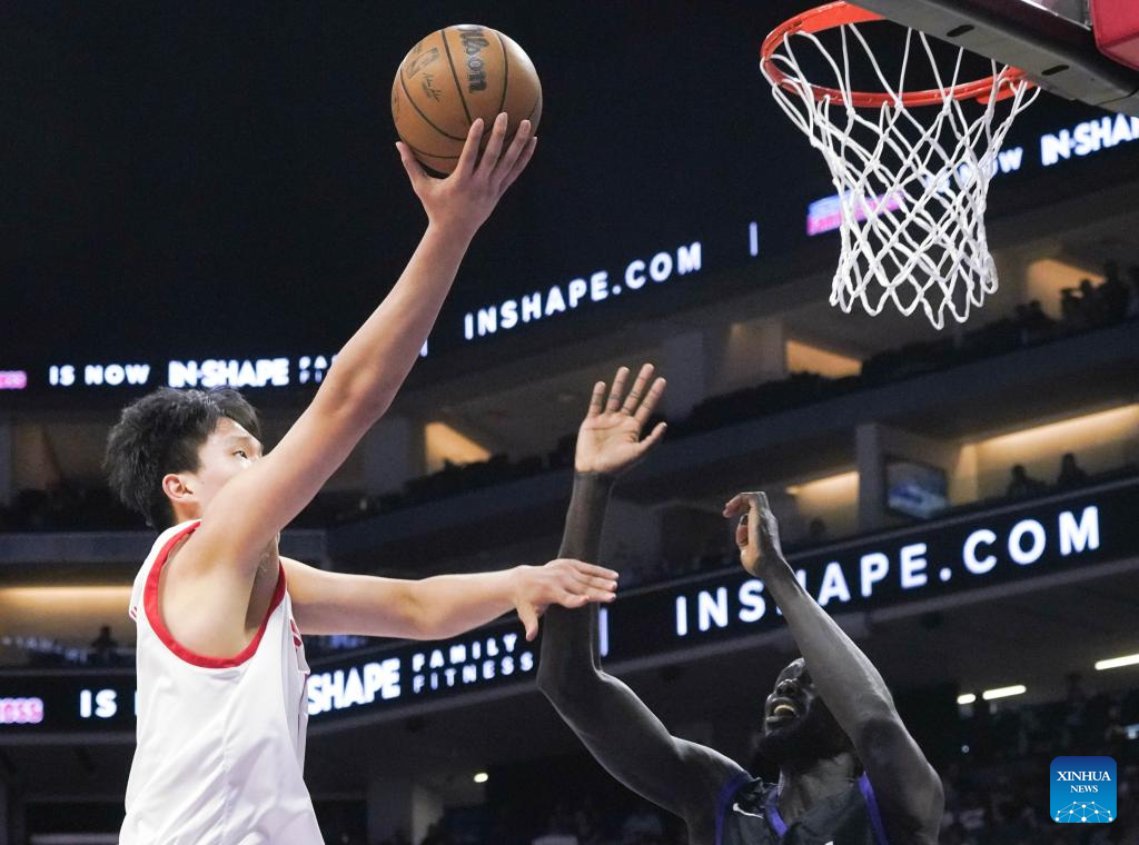 Yang Hansen (L) of China goes for a layup during the match between China and Sacramento Kings 1 at the 2024 California Classic NBA Summer League at the Golden 1 center in Sacramento, the United States, July 6, 2024. (Xinhua/Wu Xiaoling)