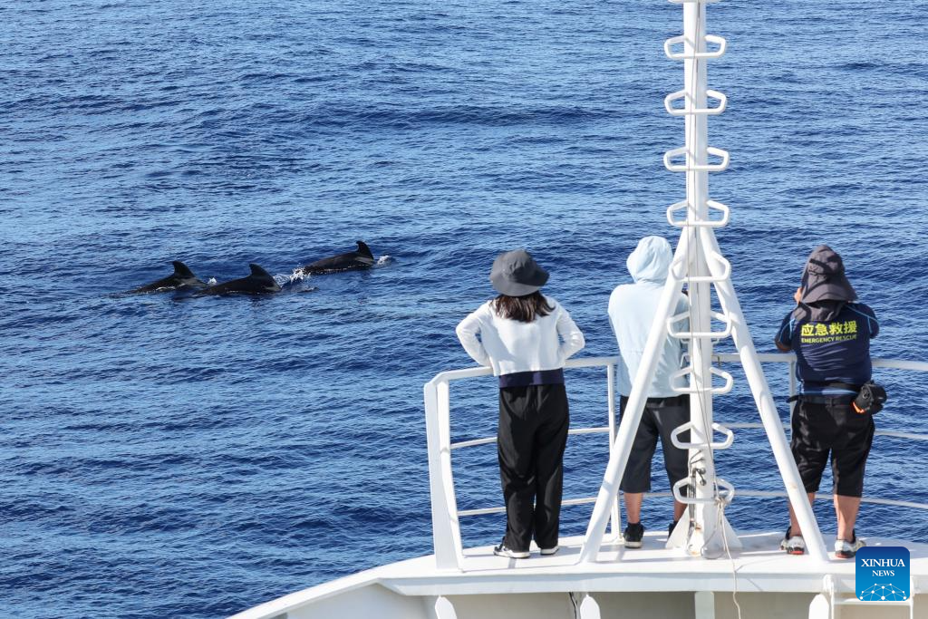 Members of a marine biodiversity expedition team observe on deck in the waters east of Hainan Island, south China, July 5, 2024. A marine biodiversity expedition team has recently witnessed a large number of cetaceans in the waters east of Hainan Island, including short-finned pilot whales, and rough-toothed dolphins. Among the cetacean species, many mother-child pairs have been spotted. (Xinhua/Zhang Liyun)