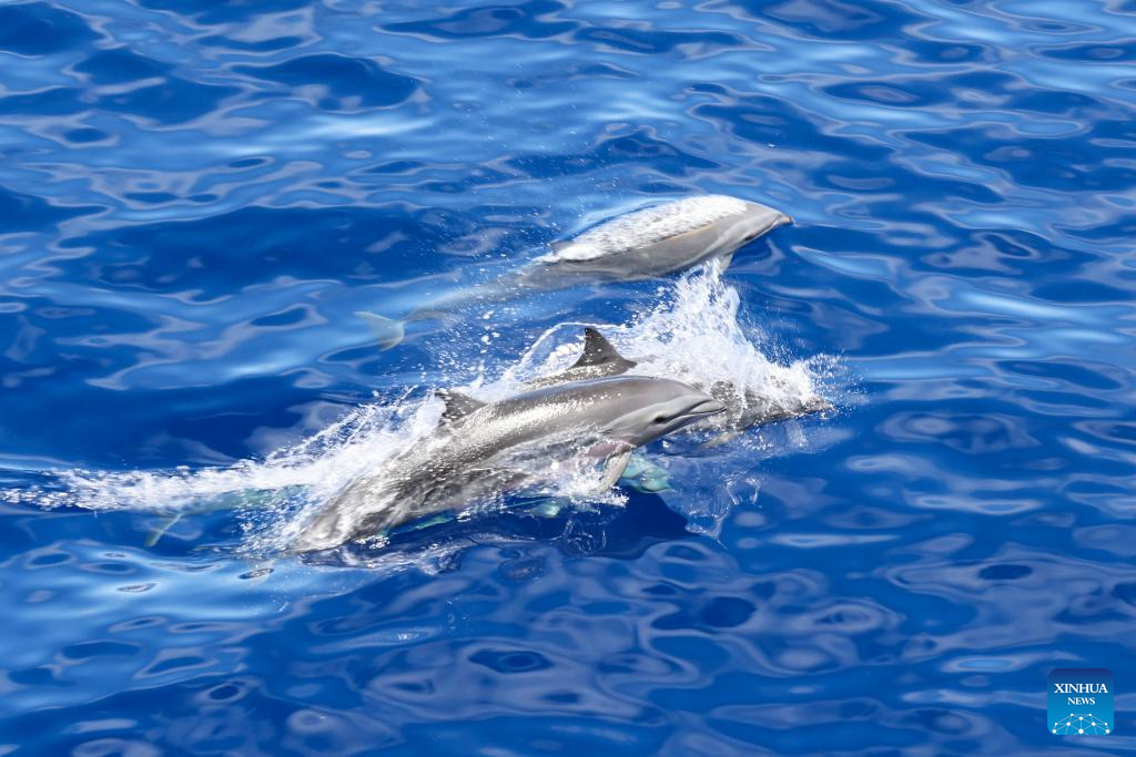 Fraser's dolphins swim in the waters east of Hainan Island, south China, July 6, 2024. A marine biodiversity expedition team has recently witnessed a large number of cetaceans in the waters east of Hainan Island, including short-finned pilot whales, Fraser's dolphins and rough-toothed dolphins. Among the cetacean species, many mother-child pairs have been spotted. (Xinhua/Zhang Liyun)