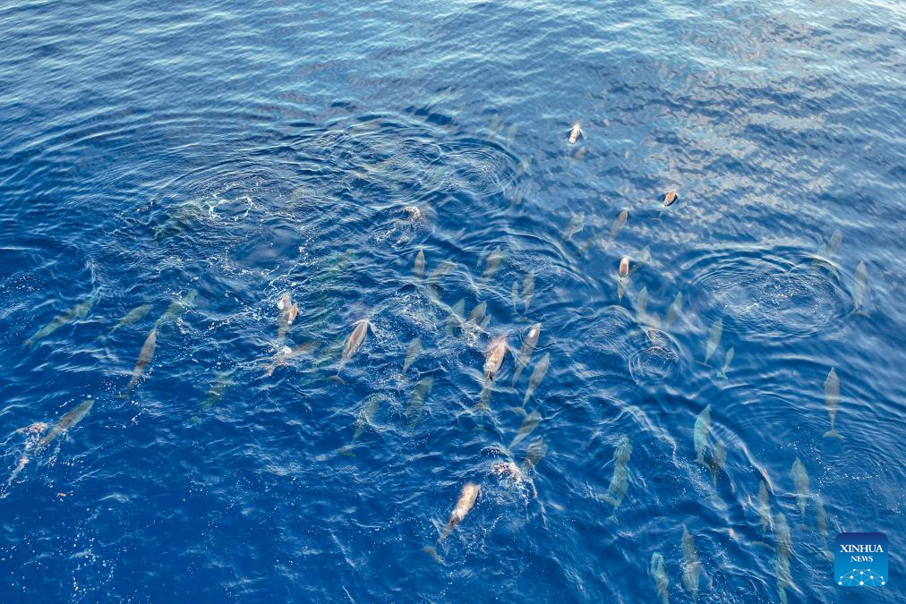 An aerial drone photo shows Fraser's dolphins swimming in the waters east of Hainan Island, south China, July 6, 2024. A marine biodiversity expedition team has recently witnessed a large number of cetaceans in the waters east of Hainan Island, including short-finned pilot whales, Fraser's dolphins and rough-toothed dolphins. Among the cetacean species, many mother-child pairs have been spotted. (Xinhua/Zhang Liyun)