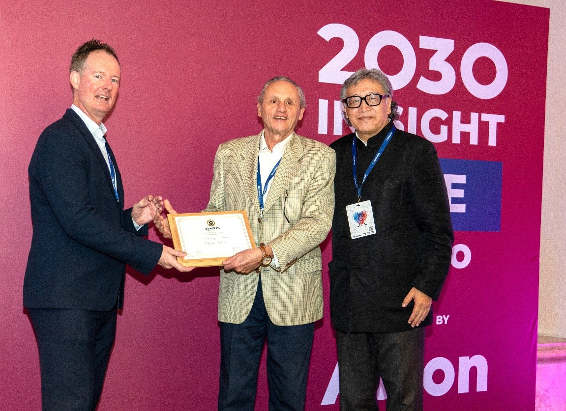 Mr. Drew Keys, the President of IAPB West Pacific and Latin America, and Professor He Wei present the appointment letter to Professor Jorge Foster from the University of Buenos Aires, Argentina. (Photo provided to People’s Daily Online)