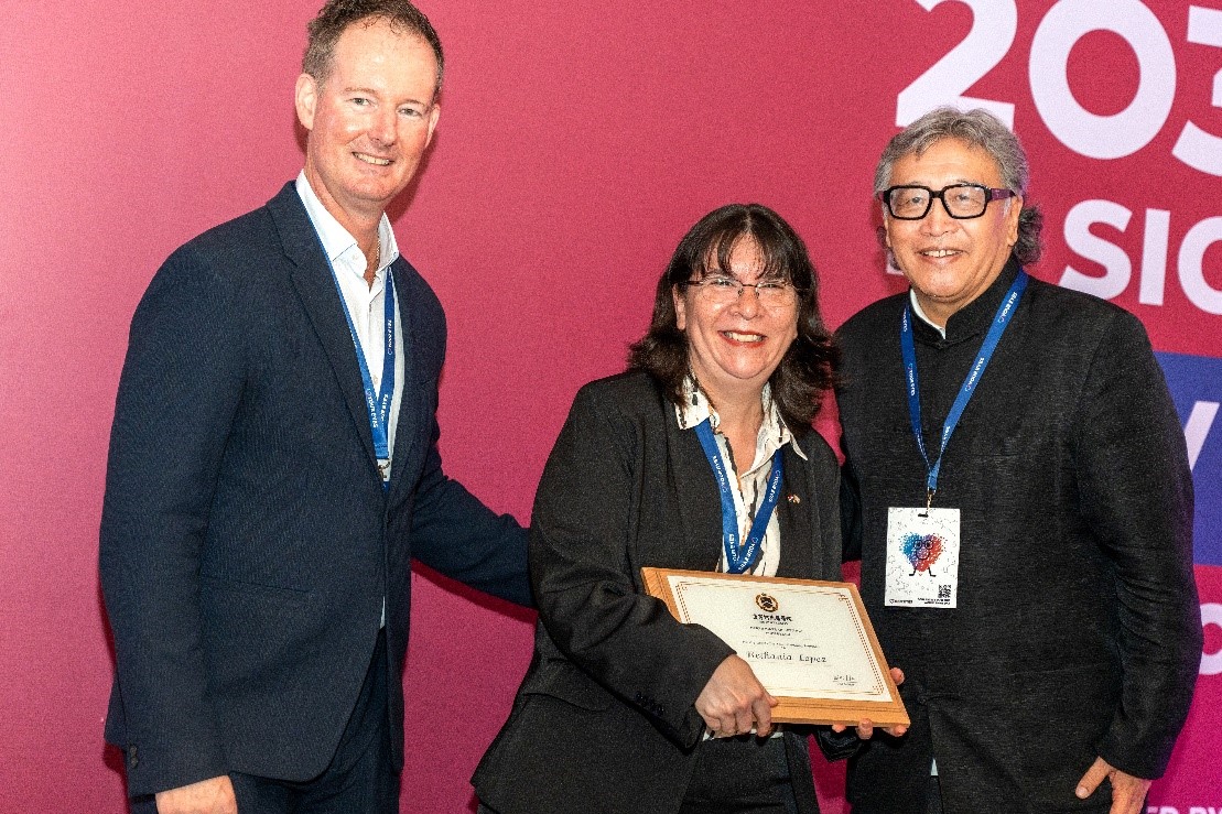 Mr. Drew Keys, the President of IAPB West Pacific and Latin America, and Professor He Wei present the appointment letter to Ms. Cristina Sanchez Gaoto, an ophthalmology specialist from Paraguay. (Photo provided to People’s Daily Online)