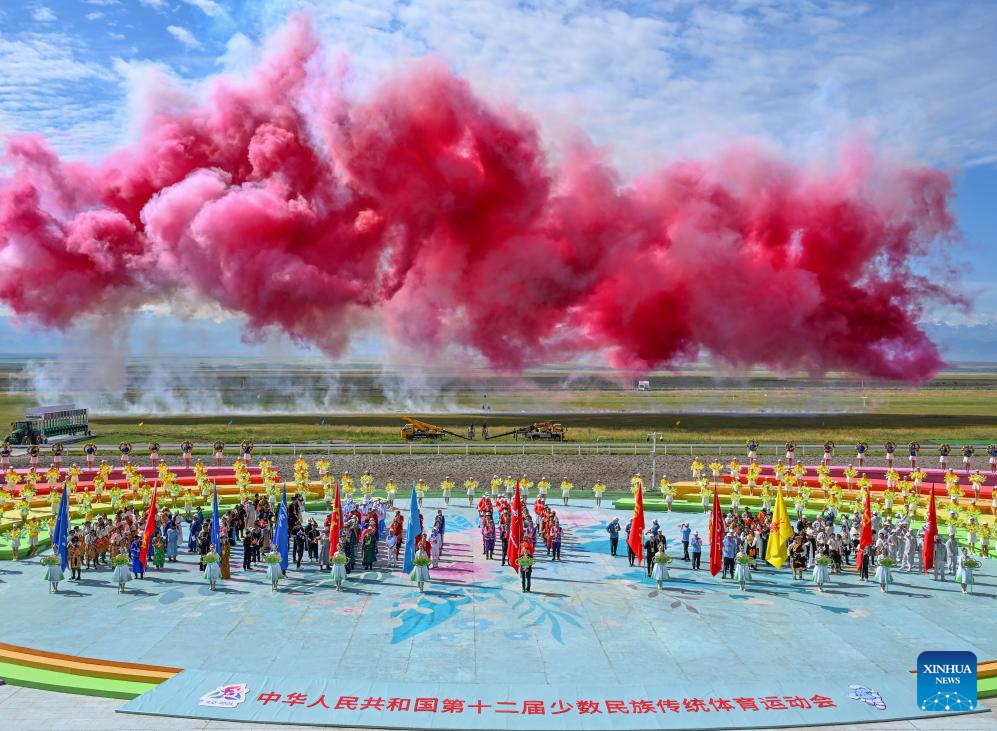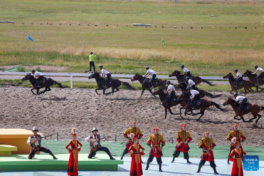 This photo taken on July 8, 2024 shows the opening ceremony of the equestrian events at the 12th National Traditional Games of Ethnic Minorities of China in Zhaosu, northwest China's Xinjiang Uygur Autonomous Region. The equestrian events, the earliest to begin in this year's Ethnic Games, will run through July 13. (Xinhua/Chen Shuo)