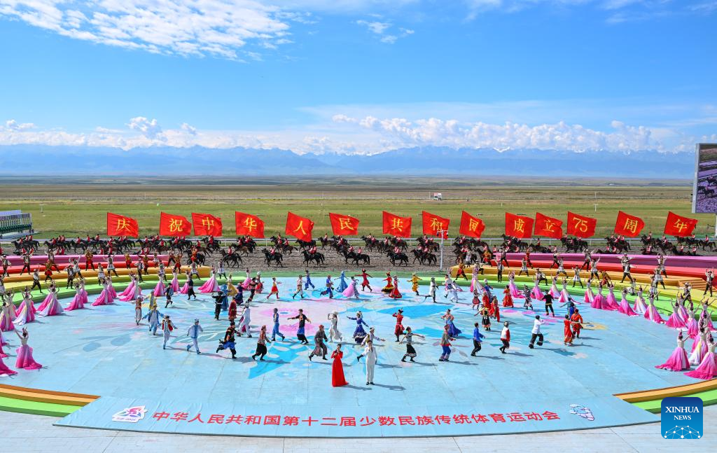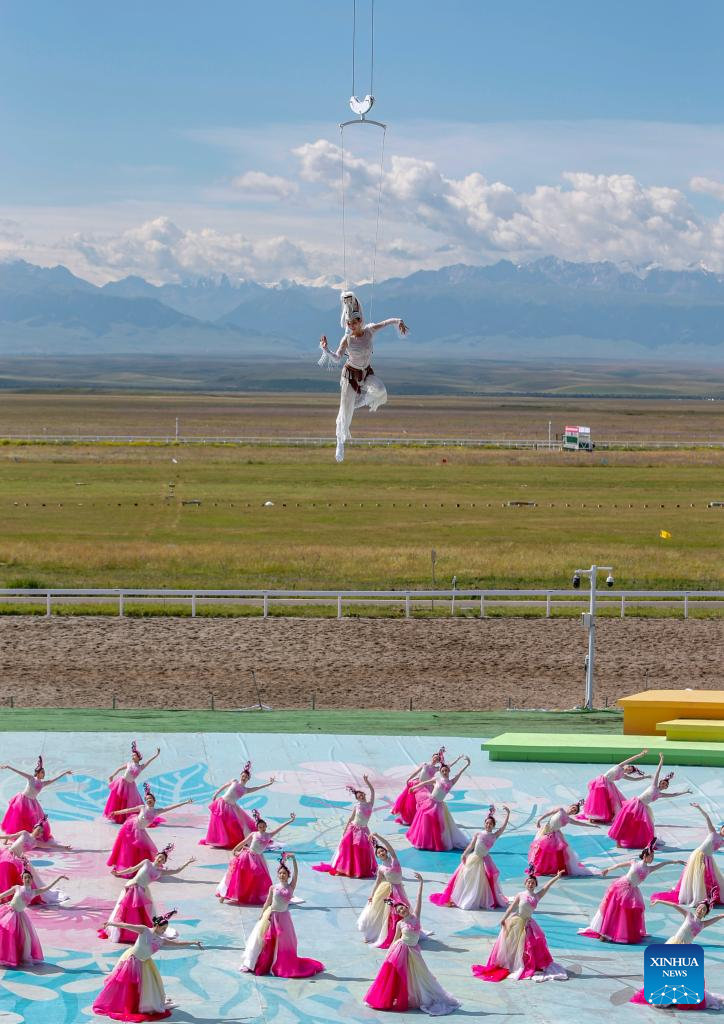 Artists perform during the opening ceremony of the equestrian events at the 12th National Traditional Games of Ethnic Minorities of China in Zhaosu, northwest China's Xinjiang Uygur Autonomous Region, July 8, 2024. The equestrian events, the earliest to begin in this year's Ethnic Games, will run through July 13. (Xinhua/Chen Shuo)