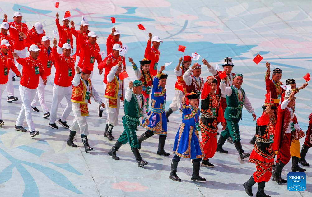 Delegation of Xinjiang Uygur Autonomous Region waves to the spectators during the opening ceremony of the equestrian events at the 12th National Traditional Games of Ethnic Minorities of China in Zhaosu, northwest China's Xinjiang Uygur Autonomous Region, July 8, 2024. The equestrian events, the earliest to begin in this year's Ethnic Games, will run through July 13. (Xinhua/Chen Shuo)