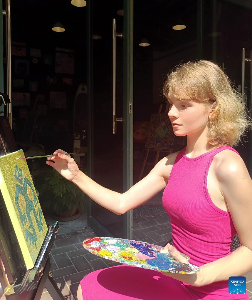 HAIKOU, July 8 (Xinhua) -- In Kuznetsova Aleksandra's studio in Haikou, capital of south China's island province Hainan, an oil painting of St. Basil's Cathedral hangs alongside a portrait of a graceful woman from the Li ethnic minority, reflecting two distinct facets of the artist's life.