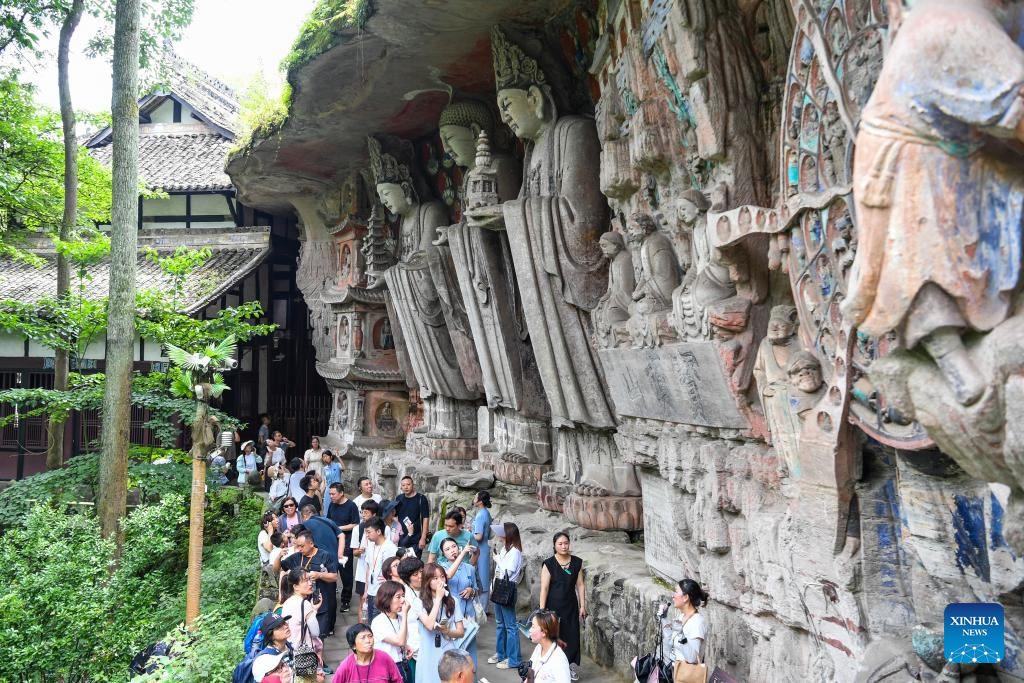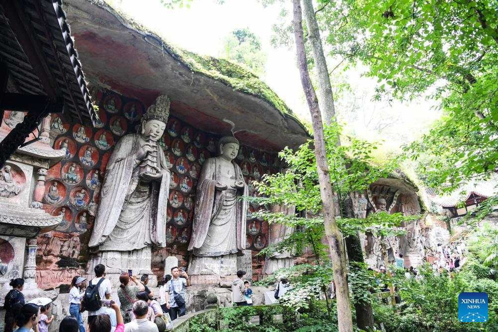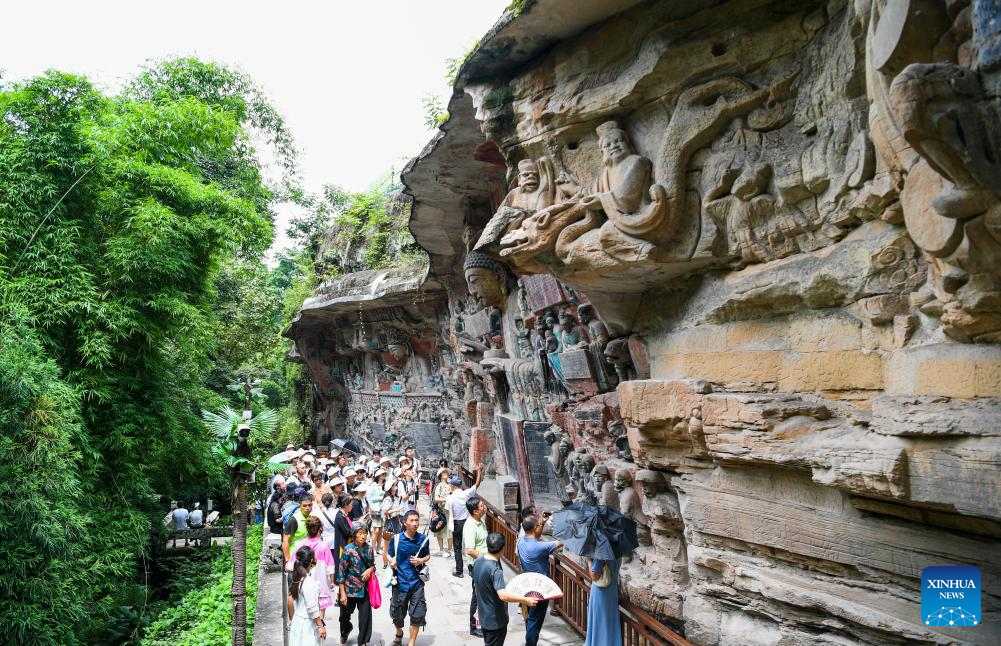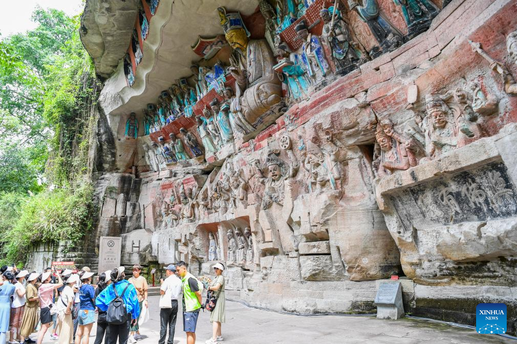 Tourists visit the scenic spot of Dazu Rock Carvings in southwest China's Chongqing, July 7, 2024. The Dazu Rock Carvings site was inscribed onto the UNESCO World Heritage List in 1999. The finest example of Chinese grotto art, the Dazu Rock Carvings site is of profound historical significance, embodying the vigorous vitality of Chinese culture. (Xinhua/Wang Quanchao)