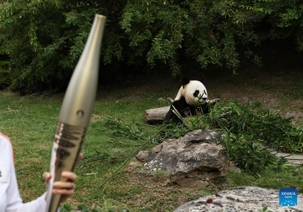 Giant panda Yuan Zai is seen before the relay of the Olympic flame of Paris 2024 at Beauval Zoo in Saint-Aignan, central France, July 8, 2024. (Xinhua/Gao Jing)