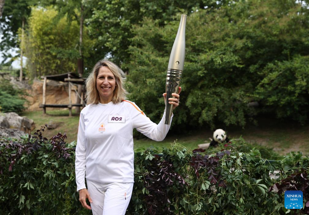 Torchbearer, French navigator Maud Fontenoy looks toward the giant panda Yuan Zai before the relay of the Olympic flame of Paris 2024 at Beauval Zoo in Saint-Aignan, central France, July 8, 2024. (Xinhua/Gao Jing)