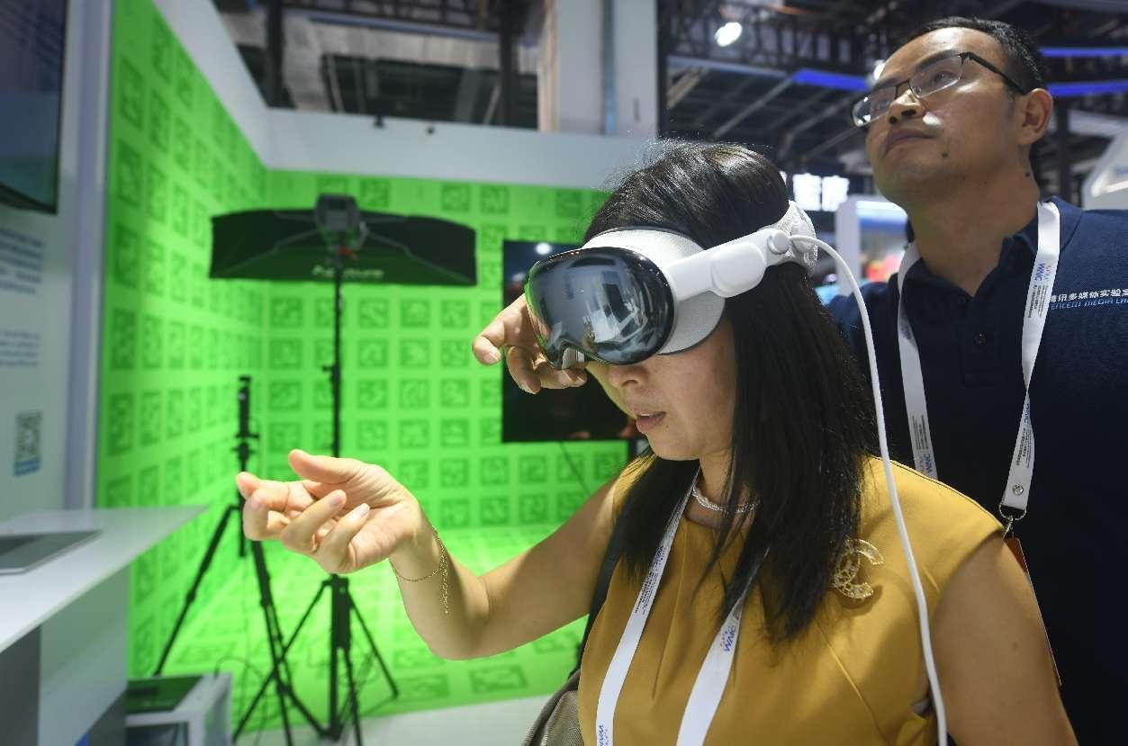 A visitor experiences the extended reality (XR) technology developed by China's tech giant Tencent at the 2024 World AI Conference (WAIC) in Shanghai, east China, July 4, 2024. (People's Daily Online/Long Wei)