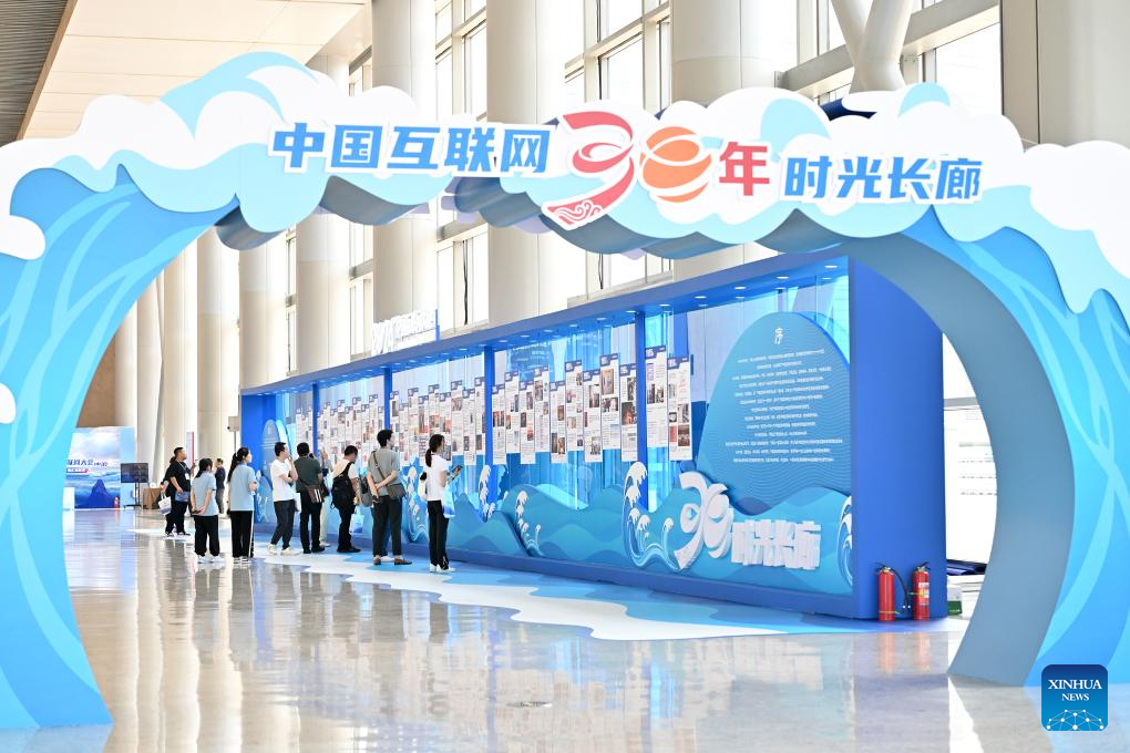 Participants visit an exhibition featuring China's internet development at the exhibition area of the 2024 China Internet Conference in Beijing, capital of China, July 9, 2024. The conference kicked off here on Tuesday and will last till July 11. (Xinhua/Li Xin)