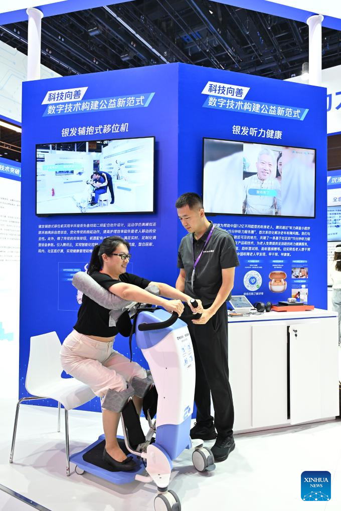 A participant (L) tries an auxiliary device for elder people at the exhibition area of the 2024 China Internet Conference in Beijing, capital of China, July 9, 2024. The conference kicked off here on Tuesday and will last till July 11. (Xinhua/Li Xin)