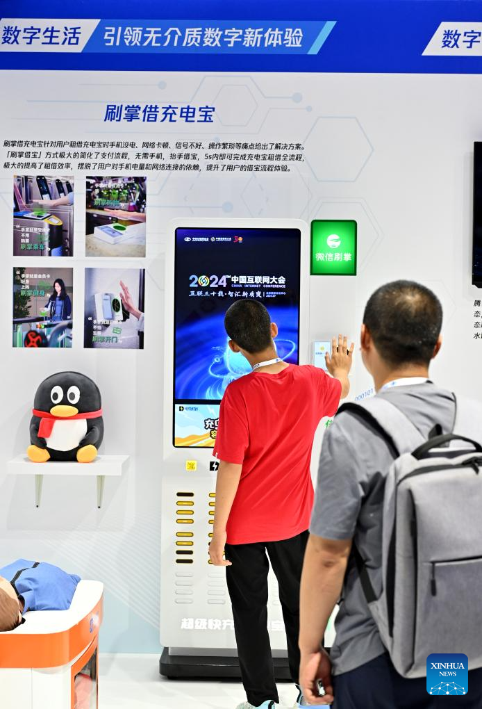 A participant tries to borrow a portable power bank by scanning palm of his hand at the exhibition area of the 2024 China Internet Conference in Beijing, capital of China, July 9, 2024. The conference kicked off here on Tuesday and will last till July 11. (Xinhua/Li Xin)