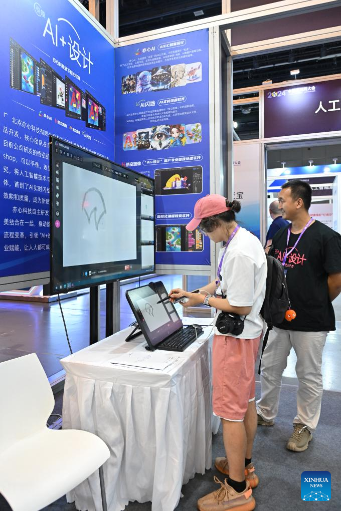 A participant (L) tries an AI painting software at the exhibition area of the 2024 China Internet Conference in Beijing, capital of China, July 9, 2024. The conference kicked off here on Tuesday and will last till July 11. (Xinhua/Li Xin)