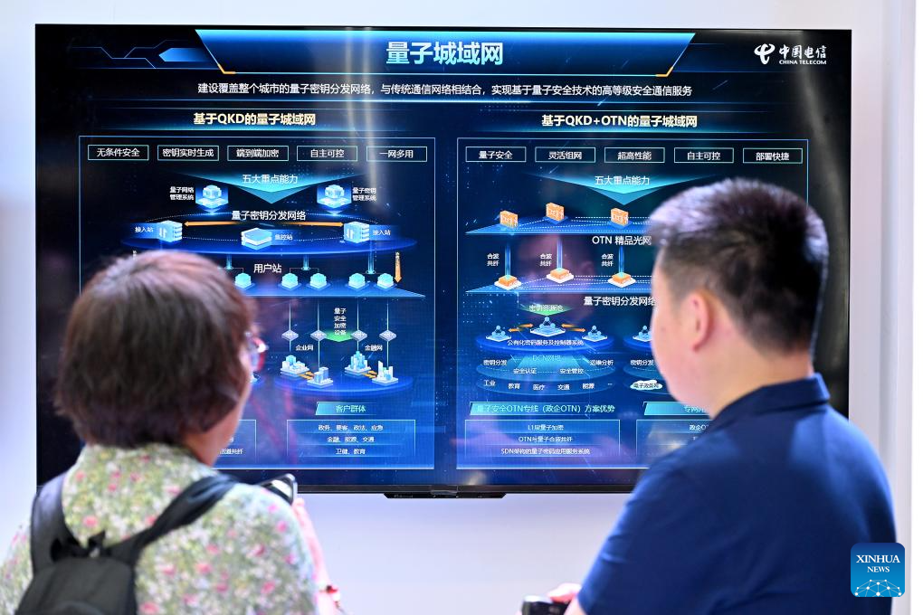 Participants learn about quantum communication at the exhibition area of the 2024 China Internet Conference in Beijing, capital of China, July 9, 2024. The conference kicked off here on Tuesday and will last till July 11. (Xinhua/Li Xin)